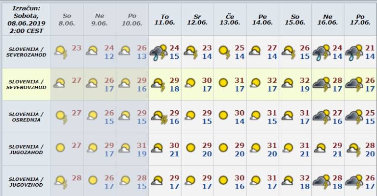 Za severovzhod Slovenije je vrhunec vročinskega vala napovedan za konec prihodnjega tedna, ko se bodo temperature gibale med 31 in 32 stopinjami Celzija. Nevihte in dež naj bi vročinski val prekinila šele prihodnjo nedeljo.