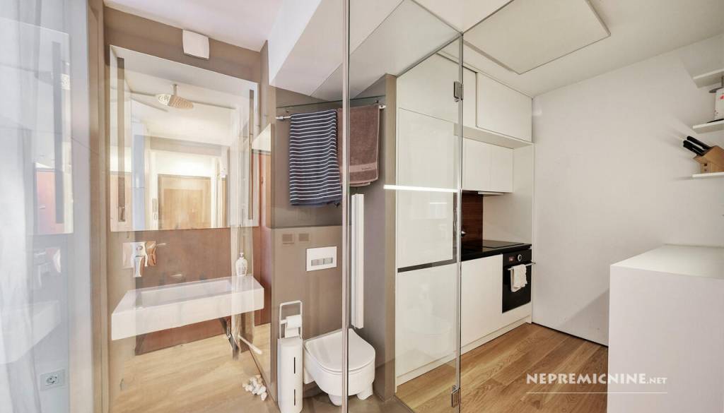Ob tem lahko opazimo, da »odlično izkoriščena kuhinja« vključuje tudi to, da lahko potek kuhanja spremljaš kar z WC školjke, saj je videti, da so se odločili, da v »izjemno funkcionalni garsonjeri« kopalnico obdajo kar s prozornim steklom.