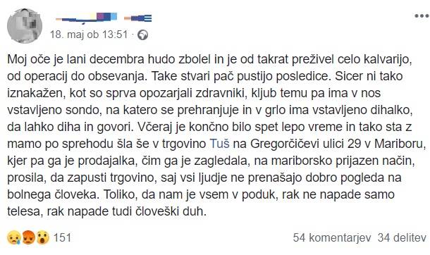 »Prodajalka ga je, čim ga je zagledala, na mariborsko prijazen način prosila, da zapusti trgovino, saj vsi ljudje ne prenašajo dobro pogleda na bolnega človeka,« o dogodku priča zapis na družbenem omrežju.