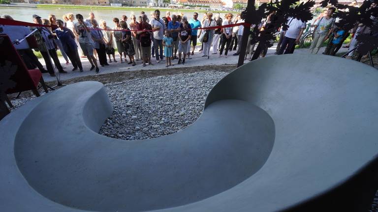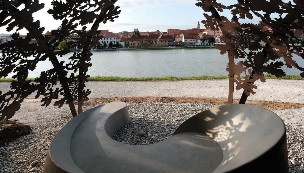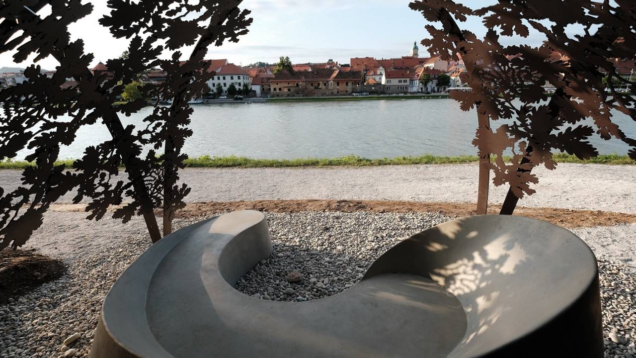 Umetniška klop ‘Trenutek’, ki je avtorsko delo akademske kiparke Vlaste Čobal Sedmak, stoji na nabrežju reke Drave.