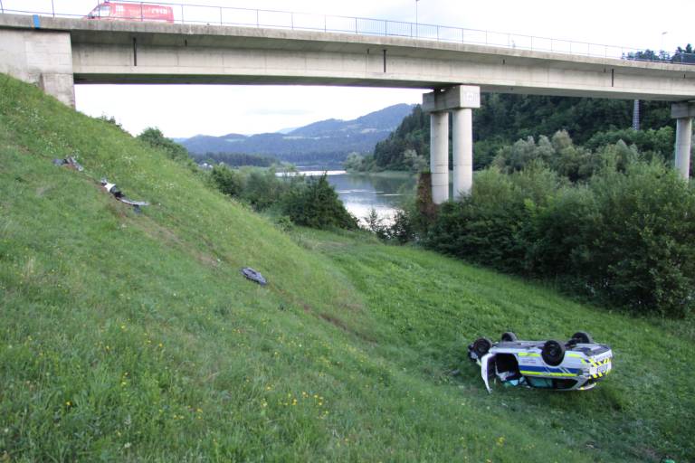 Patrulji se je pridružila še druga policijska patrulja, ki je po približno treh kilometrih zaradi zastoja na cesti uspela dohiteti voznika kombija. Z namenom, da bi preprečila nadaljnje ogrožanje, je patrulja zapeljala pred kombinirano vozilo. Voznik slednjega je sunkovito speljal, trčil v vozilo policije in z veliko hitrostjo zapeljal v smeri Dravograda. Patrulja je z namenom, da bi vozilo ustavila in preprečila nadaljnje ogrožanje, v križišču za Trbonje pričela prehitevati kombinirano vozilo. Ko je bilo patruljno vozilo ob kombiju, je voznik slednjega sunkovito zavil v levo in namerno trčil v desni bok vozila policije, zaradi česar je vozilo policije odbilo v zaščitno ograjo mostu čez reko Dravo, jo poškodovalo, vozilo policije pa je zdrselo približno 30 m po strmem pobočju, kjer se je obrnilo na streho in ustavilo- le pet metrov pred strugo reke Drave. Na srečo se je tokrat končalo le s poškodbami policistov in vozila.