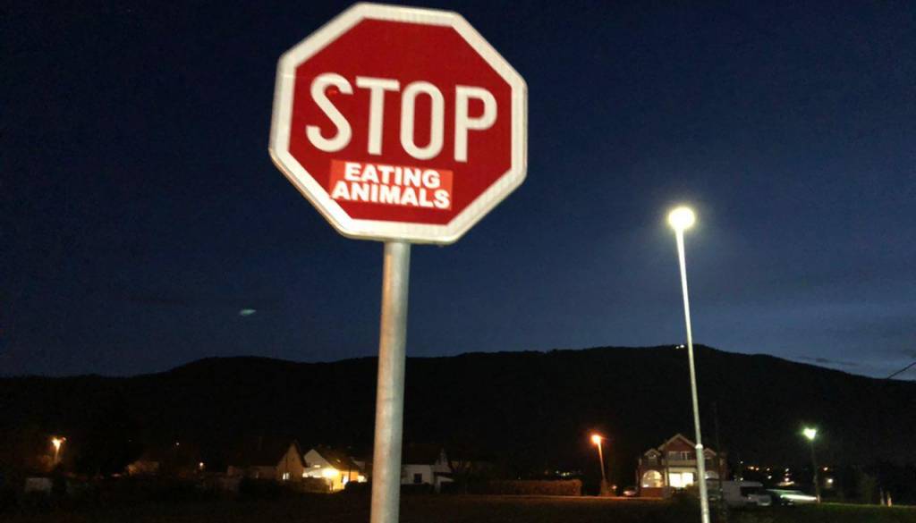 V zadnjem času so veganski aktivisti vse bolj dejavni. Poleg protestov pa zdaj očitno k prenehanju uživanja živali opozarjajo tudi z nalepkami na prometnih znakih.