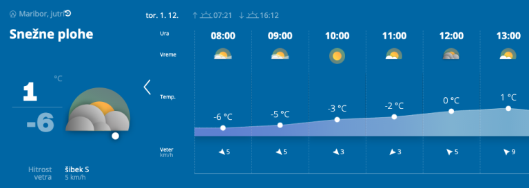 Vremenska napoved Agencije Republike Slovenije za okolje sicer kaže, da bi prvi sneg v Mariboru lahko dočakali že v torek, a podrobna vremenska napoved po urah ne razkriva, kdaj bi lahko v mestu ujeli prve snežinke.