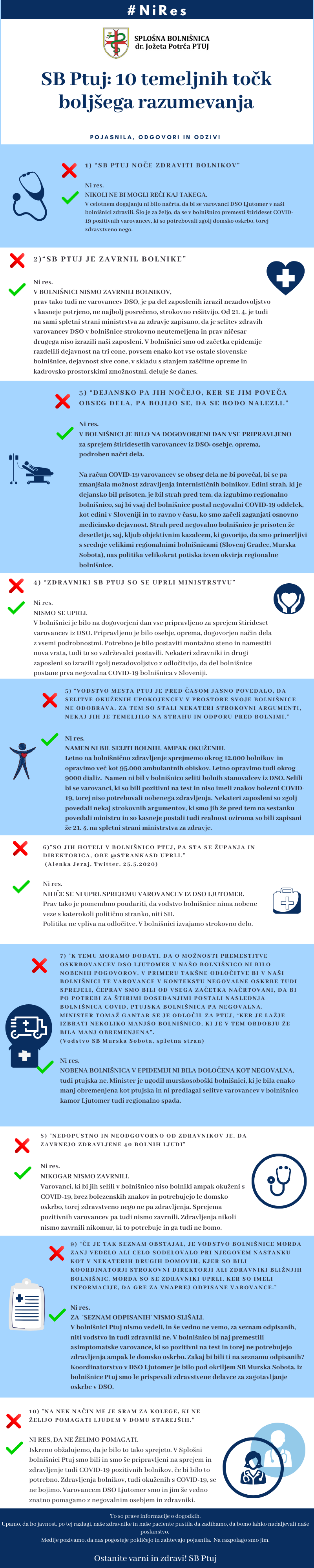 Splošna bolnišnica dr. Jožeta Potrča Ptuj je po aferi, ki je izbruhnila po načrtu vlade, da v ptujsko bolnišnico premesti s koronavirusom okužene starostnike iz Doma starejših občanov Ljutomer, šele zdaj objavila »10 temeljnih točk za boljše razumevanje«.