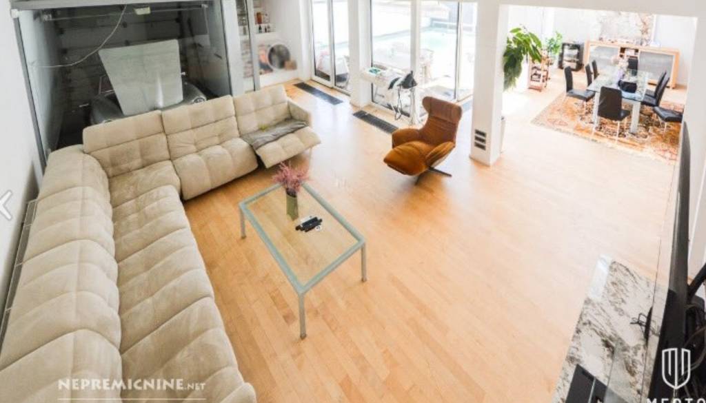 V prostorni in svetli dnevni sobi je za kavčem steklena stena, skozi katero se vidi v garažo.