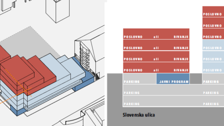 Ne nazadnje je načrtovana gradnja nove poslovno-večstanovanjske stavbe. »Stavbna masa vogalnega objekta bo razgibana, hkrati pa se bo višinsko povezala z okolico. Oblikovno bo objekt sestavljen iz vkopanega podstavka, 'transparentnega' pritličja in terasaste forme, naložene na pritličje. Terasasta forma bo v vsakem nadstropju omogočala prostoren zunanji prostor, ki bo delno zazelenjen,« je zapisano v osnutku predlagane ureditve.
