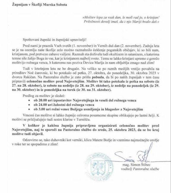 Molitev bi tako potekala iz petka na soboto (iz 27. na 28. oktober), iz sobote na nedeljo (iz 28. na 29. oktober), iz nedelje na ponedeljek (iz 29. na 30. oktober) in iz ponedeljka na torek (iz 30. na 31. oktober),« je še razvidno iz dopisa.