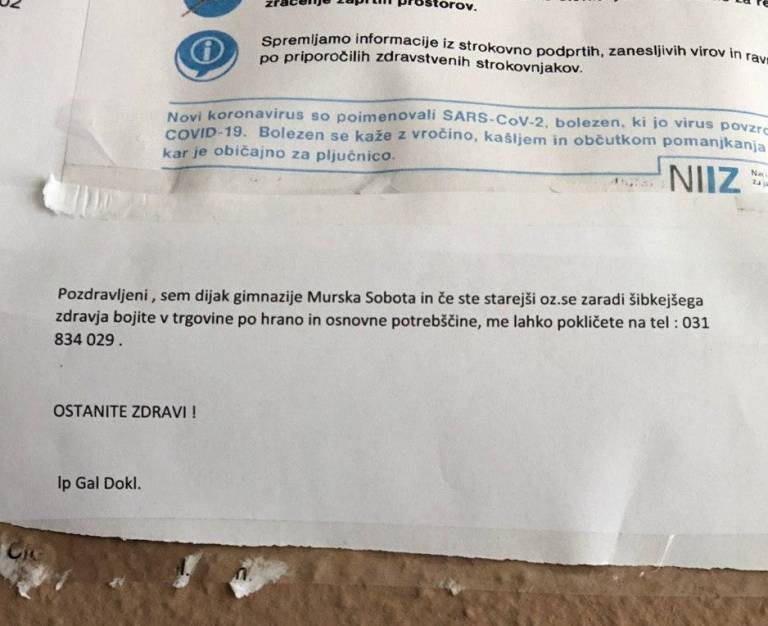 »Pozdravljeni, sem dijak Gimnazije Murska Sobota in če ste starejši oziroma se zaradi šibkejšega zdravja bojite v trgovine po hrano in osnovne potrebščine, me lahko pokličete. Ostanite zdravi,« je sporočilo, ki smo ga opazili na steni enega izmed blokov v Murski Soboti.