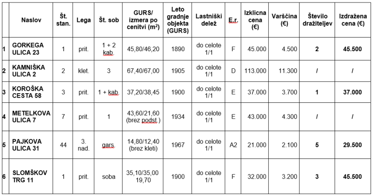 Na dražbi so tako ponudili stanovanje na Gorkega ulici, trisobno stanovanje na Kamniški ulici, 38 kvadratov veliko stanovanje na Koroški cesti, pritlično stanovanje na Metelkovi ulici, ter stanovanji na Pajkovi ulici in Slomškovem trgu.