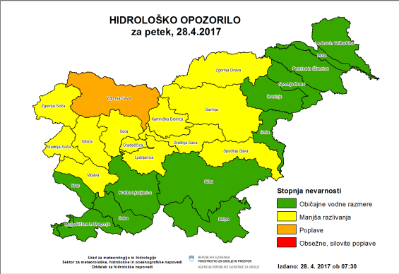 Danes bodo predvidoma naraščale še reke v Posočju, v porečjih Vipave, Savinje in Dravinje ter Sava v srednjem toku. Močneje bo narasla tudi Sava v spodnjem toku. Na omenjenih porečjih rek so možna razlivanja na območjih vsakoletnih poplav. Ob močnejših nalivih so zlasti v hribovitih delih osrednje, severne in severovzhodne Slovenije še vedno možna tudi razlivanja manjših rek in hudourniških vodotokov. Nekaj preglavic pa so močnejši nalivi že povzročili.
