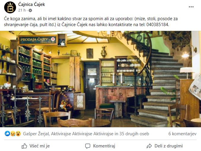 »Če koga zanima, ali bi imel kakšno stvar za spomin ali za uporabo: (mize, stoli, posode za shranjevanje čaja, pult itd.) iz Čajnice Čajek, nas lahko kontaktirate,« so zapisali.