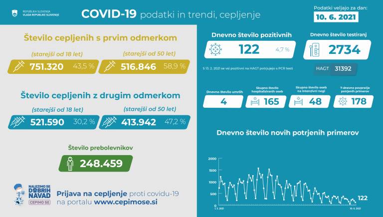 V Sloveniji so včeraj, 10. junija, opravili 2734 PCR testiranj na koronavirus in potrdili 122 novih okužb, gre za 4,7-odstotni delež okužb. Aktivnih okužb v Sloveniji je trenutno 3084.