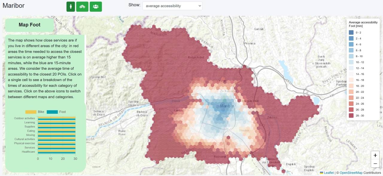 V središču Maribora za dostop do osnovnih storitev v povprečju potrebujemo 17 minut hoje ali sedem minut kolesarjenja.