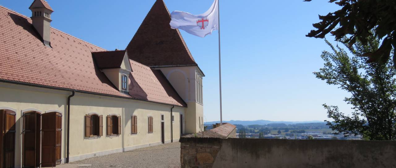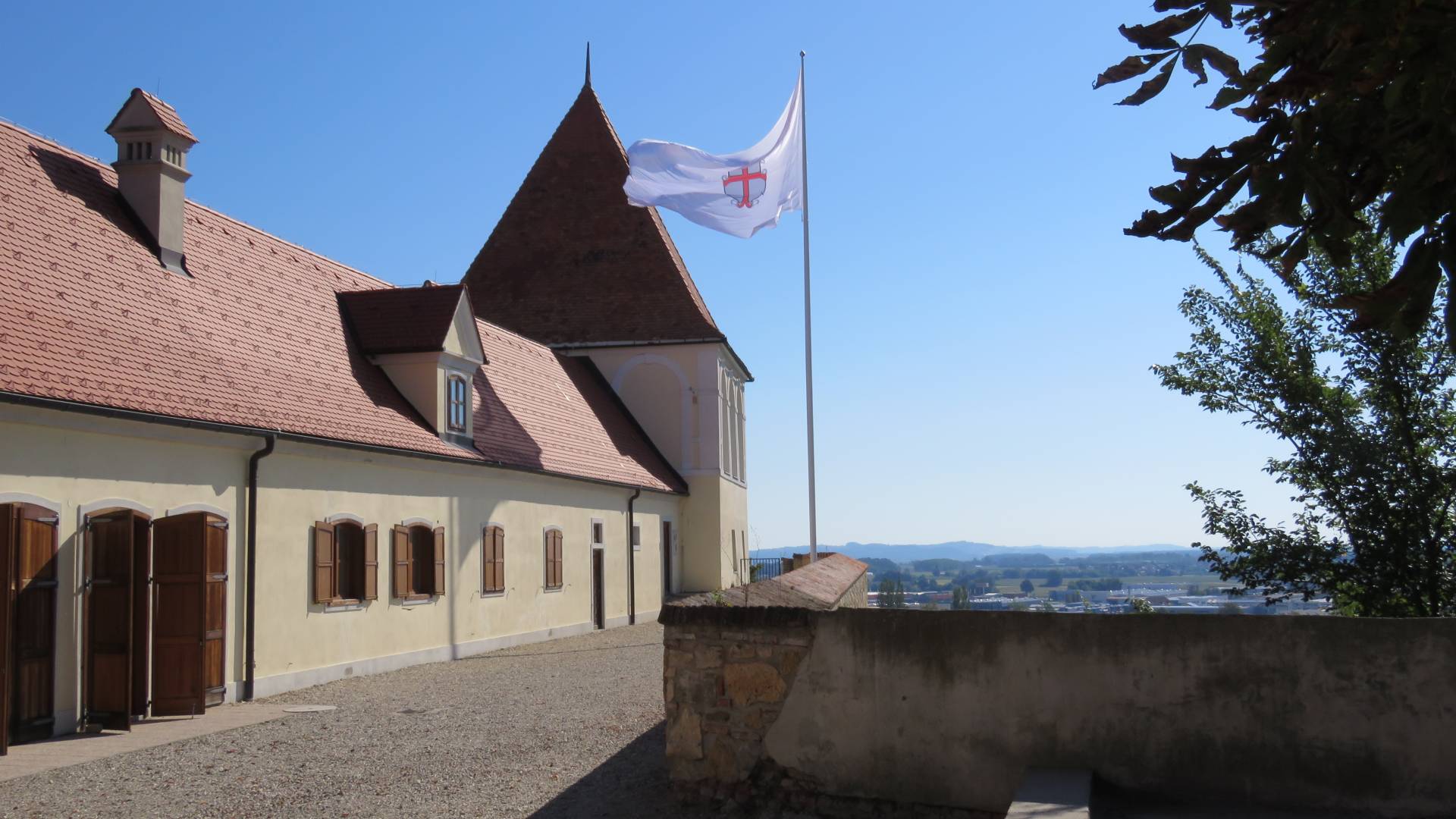Zastava na zunanjem dvorišču Ptujskega gradu sicer meri štiri krat osem metrov in visi na 16 metrov visokem drogu.