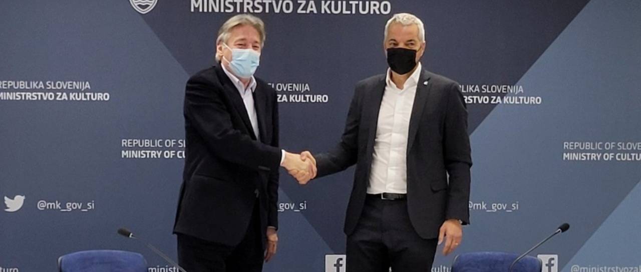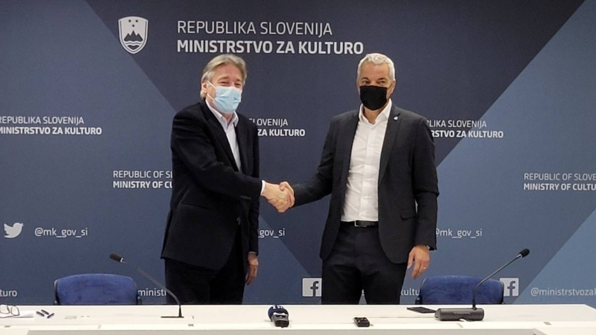Minister za kulturo Vasko Simoniti in mariborski župan Aleksander Arsenovič sta danes podpisala pogodbo o sofinanciranju projekta Center Rotovž v Mariboru.