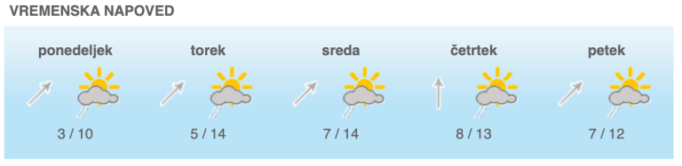 Jugozahodnik se bo nekoliko okrepil. V torek bo na zahodu in jugu pretežno oblačno z manjšimi padavinami, drugod bo deloma sončno. Ob morju bo zapihal jugo, predvsem v višjih legah ter v severovzhodni Sloveniji bo pihal jugozahodnik. Tudi v sredo in četrtek bo v vzhodnih krajih še delno jasno, drugod pretežno oblačno. Predvsem v hribovitem svetu zahodne in južne Slovenije bo občasno rahlo deževalo. Toplo bo, napovedujejo državni meteorologi.