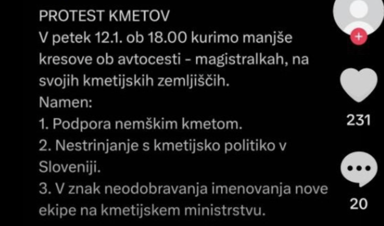 Kmetje naj bi za danes, ob 18. uri, napovedali protest. Kurili naj bi manjše kresove ob avtocestah in magistralah, na svojih kmetijskih zemljiščih.