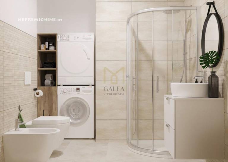 Hlajenje je urejeno talno. Kopalnica je opremljena s tuš kadjo z armaturo in WC školjko. Stanovanju pripada parkirno mesto v garaži, ki je vključeno v ceno stanovanja.
