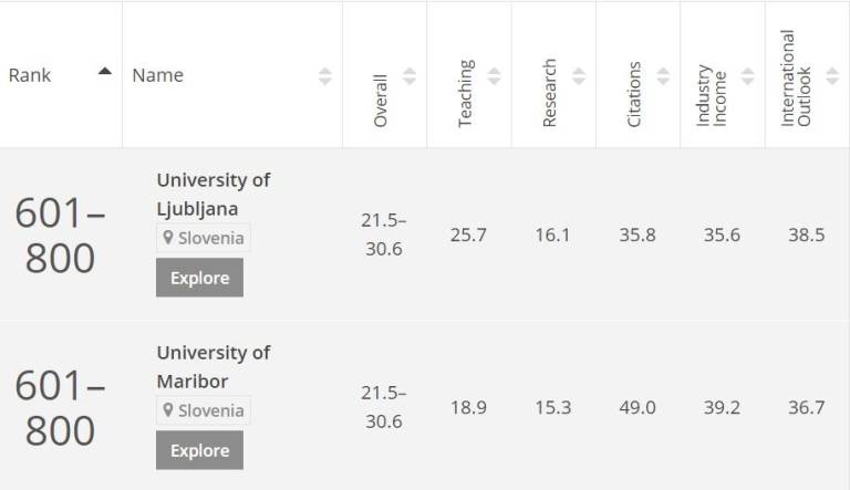 Univerza v Mariboru in Ljubljani sta si obe prislužili skupno oceno 30.6, kar ju uvršča od 601. do 800. mesta. Sta pa slovenski univerzi različno uspešni na področjih, ki so jih ocenjevali.