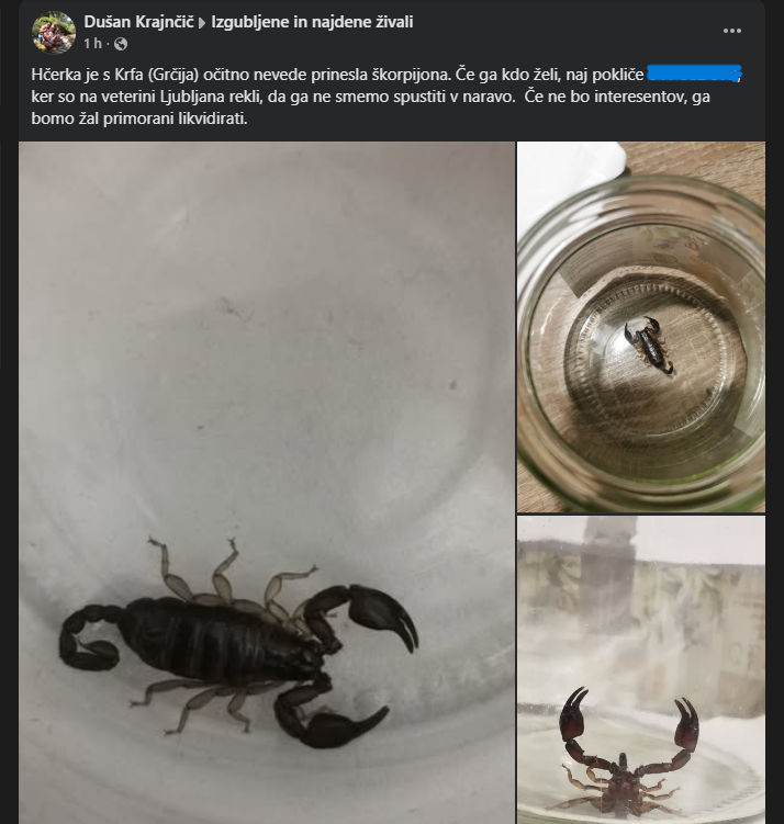 Te dni je na Facebooku zaokrožila zanimiva, a nekoliko bizarna objava. Dekle naj bi z dopusta na Krfu v Ljubljano nevede prineslo tujo vrsto ščipalca. Škorpijonu iščejo domek, da ga ne bi bilo treba usmrtiti.