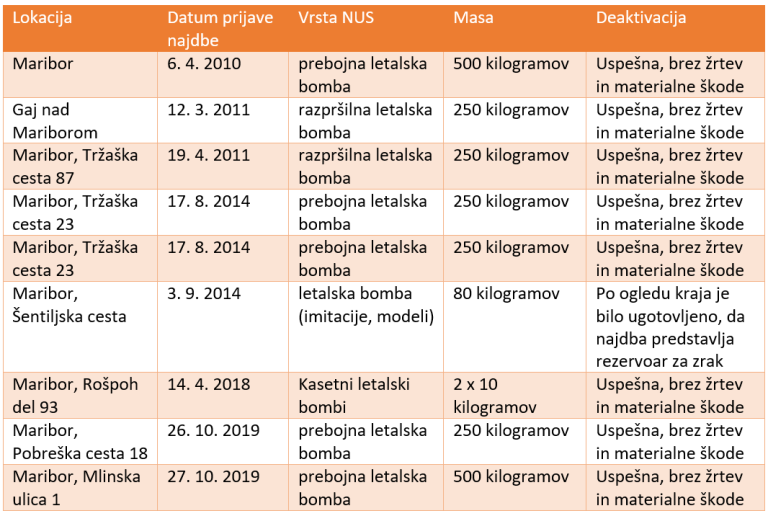 Izhajajoč iz podatkov Državne enote za varstvo pred neeksplodiranimi ubojnimi sredstvi je bilo v obdobju od leta 2010 do 2019 najdenih in uspešno deaktiviranih devet letalskih bomb na območju Mestne občine Maribor.