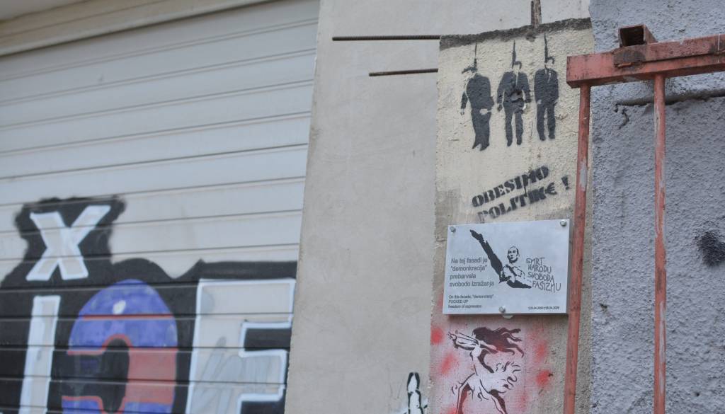 Pred dobrim mesecem so gasilci in policisti iz fasade izbrisali grafit predsednika vlade Janeza Janše z iztegnjeno roko in napisom 'Smrt narodu, svoboda fašizmu'. Včeraj pa so v Pekarni na steno pod nekdanjim grafitom postavili spominsko obeležje.