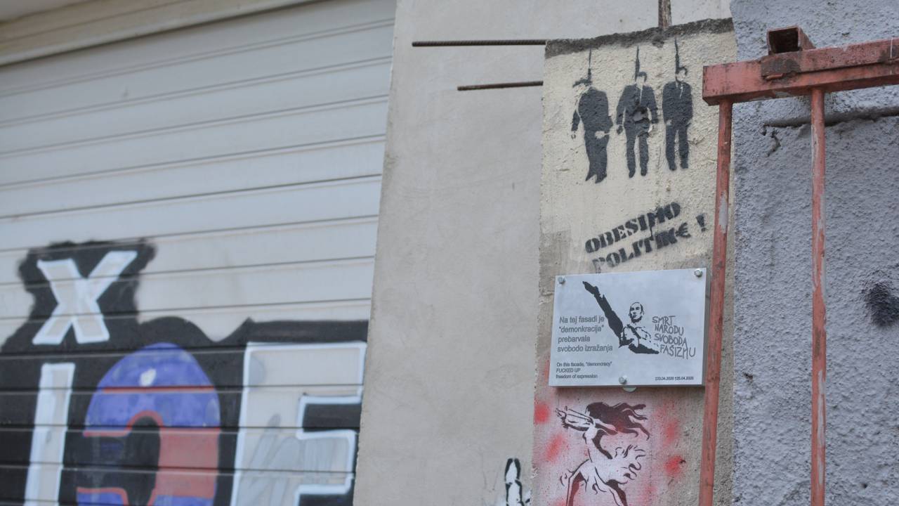 »V zvezi s tem je prijavitelj želel podati kazensko ovadbo. Policisti so z ogledom kraja dejanja ugotovili, da je neznani storilec na steno na območju MC Pekarna pritrdil kamnito ploščo z napisom 'Na tej fasadi je 'demonkracija' prebarvala svobodo izražanja', na desni strani je zraven podobe osebe z iztegnjeno roko napis 'Smrt narodu, svoboda fašizmu',« ugotavljajo na Policijski upravi Maribor.