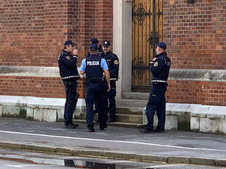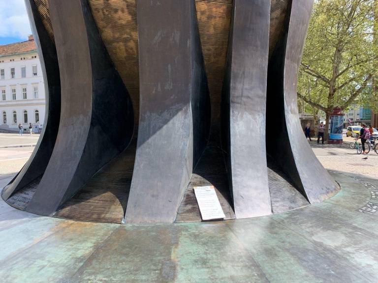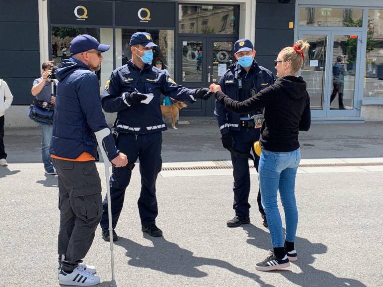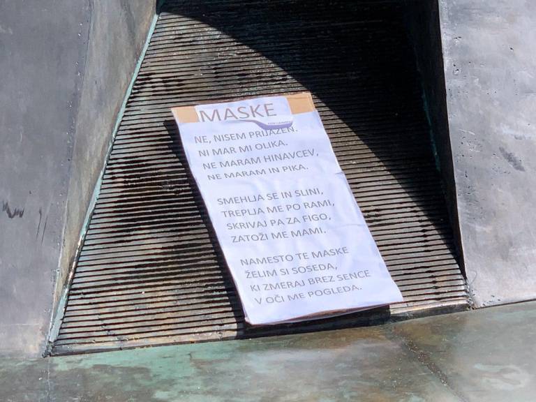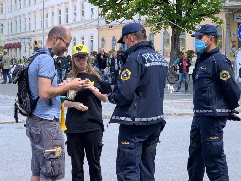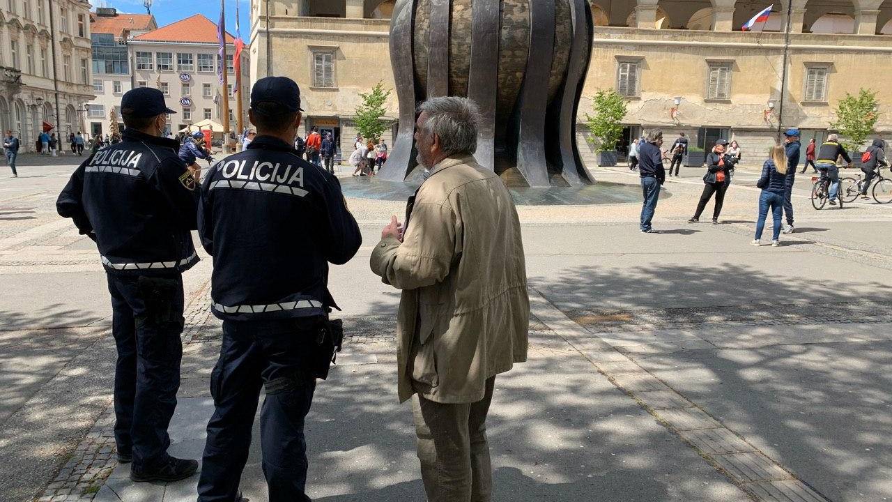 Policisti popisujejo tiste, ki so ob spomeniku kaj odložili. Eden izmed protestnikov je ob spomeniku pustil granitno kocko, druga transparent s pesnitvijo, tretja rdeče nageljne. Vzdušje med protestniki je precej sproščeno, nekateri med popisovanjem jedo sladoled.