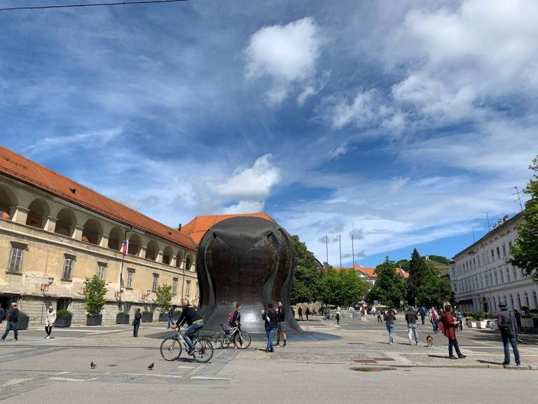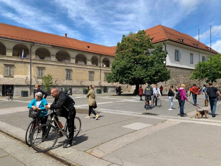 Udeleženci shoda so se zbrali na Trgu svobode. Nekateri protestniki so prišli peš, drugi kolesarijo okoli spomenika in žvižgajo.