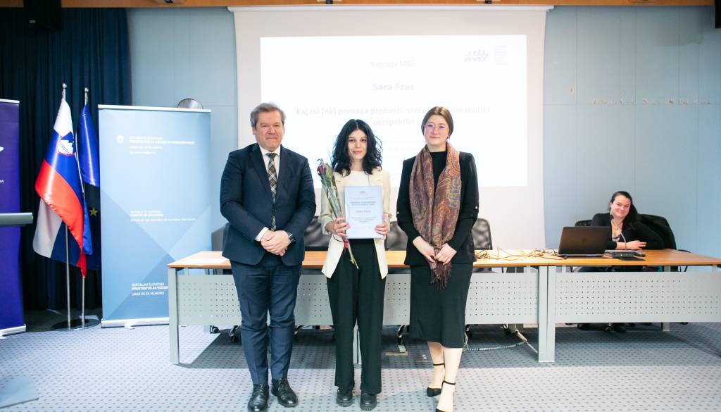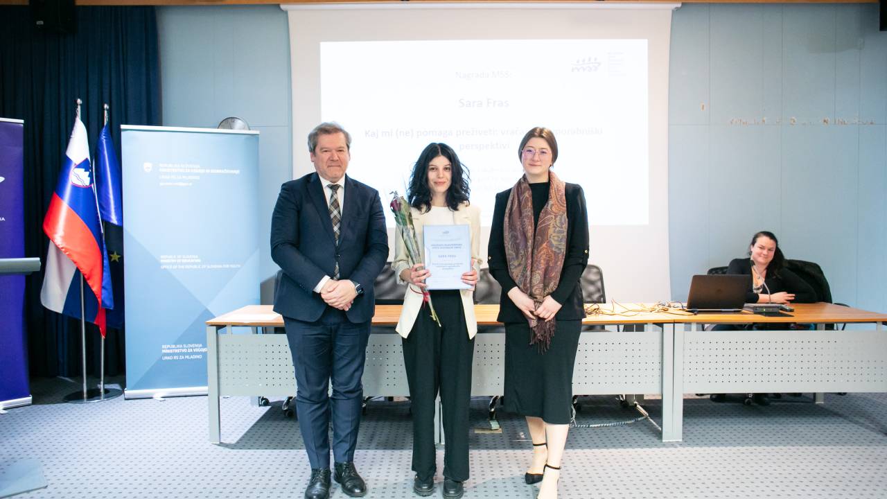 Sara Fras iz Ljubljane je prejela nagrado Mladinskega sveta Slovenije za najboljše diplomsko delo s področja mladih za delo z naslovom Kaj mi (ne) pomaga preživeti: vračanje k uporabniški perspektivi.
