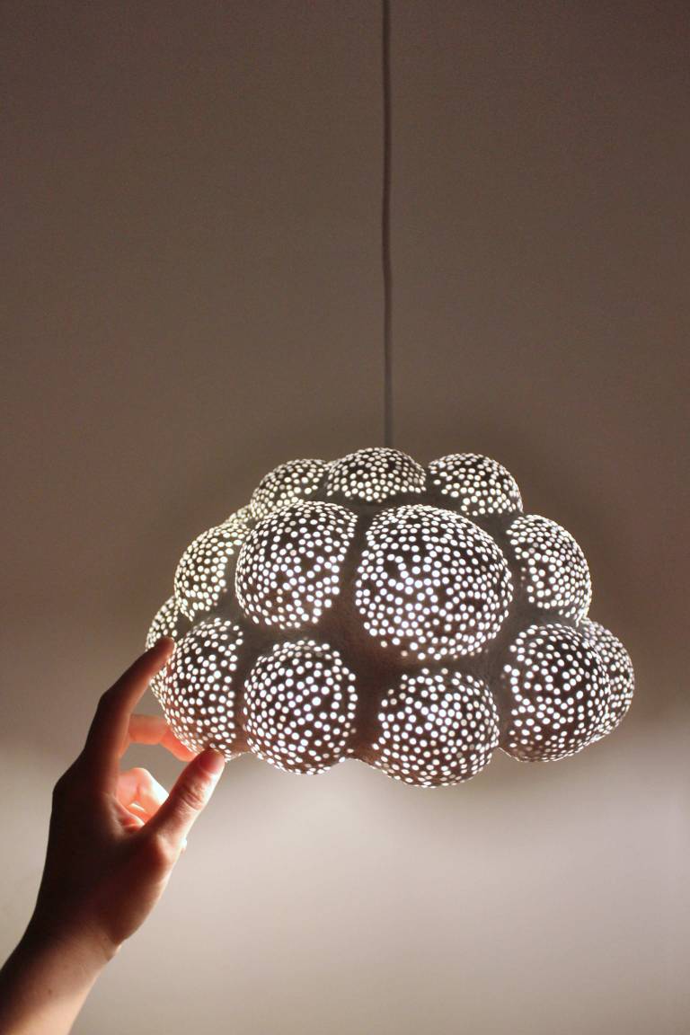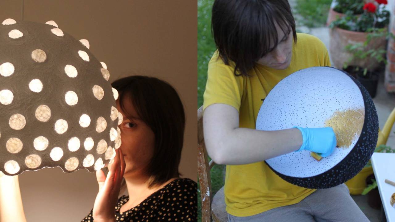 Odpadni material namoči v vodo, ga premeša, da razpade, doda lepila. Nato se začne polaganje mase v kalupe. Maso gladi, oblikuje, doda prosojne predmete in tako počasi nastaja čisto unikatno svetilo.
