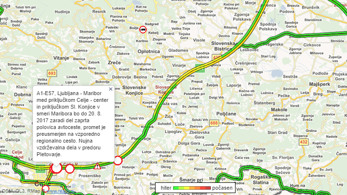 Danes, do predvidoma 24. ure, bo zaradi del zaprta štajerska avtocesta med priključkoma Celje center in Slovenske Konjice ter uvoza Celje vzhod in Dramlje proti Mariboru, opozarja Prometno-informacijski center