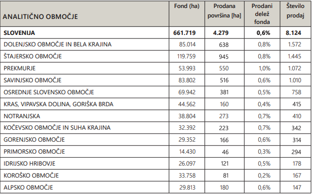 Glede na kmetijske površine in število transakcij s kmetijskimi zemljišči lahko kot ‘kmetijska območja’ države opredelimo pet tržnih analitičnih območjih, in sicer Dolenjsko območje in Belo Krajino, štajersko območje, Prekmurje, Savinjsko območje in Osrednjeslovensko območje.