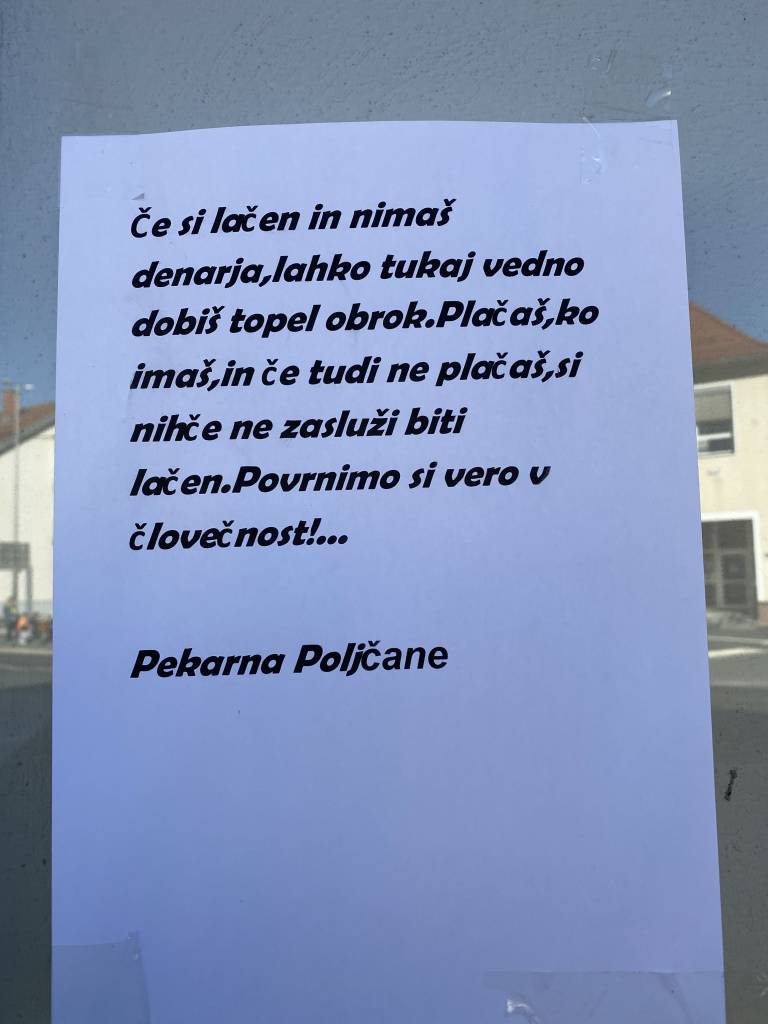 »Če si lačen in nimaš denarja, lahko tukaj vedno dobiš topel obrok. Plačaš, ko imaš in če tudi ne plačaš, si nihče ne zasluži biti lačen. Povrnimo si vero v človečnost! Pekarna Poljčane,« je napis, ki obiskovalce pričaka na vratih te družinske pekarne.