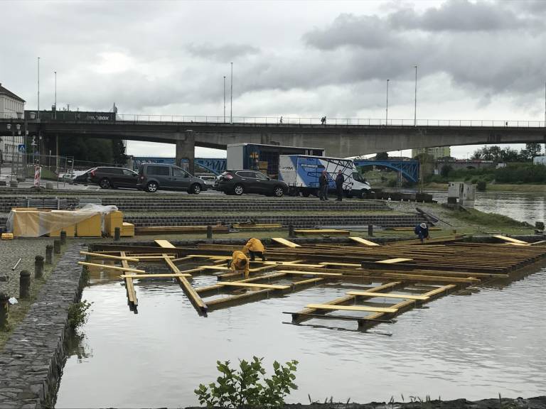 Delavci so s postavitvijo letnega odra na Dravi, ki naj bi bil postavljen do festivala Lent, začeli že konec aprila, a šele zdaj zloglasni oder začenja dobivati obliko.