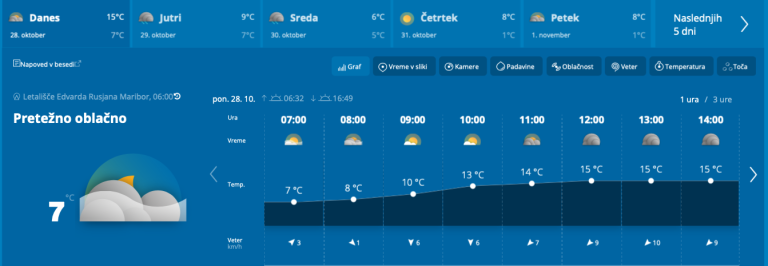 Jutri bo oblačno, občasno bo deževalo. Zvečer se bo meja sneženja spustila do okoli 1400 metrov nadmorske višine. Pihal bo severovzhodni veter, burja na Primorskem se bo popoldne krepila. Temperature bodo od 7 do 11, na Primorskem od 12 do 16 stopinj Celzija.