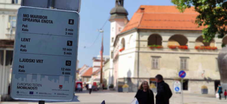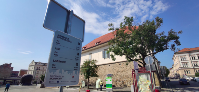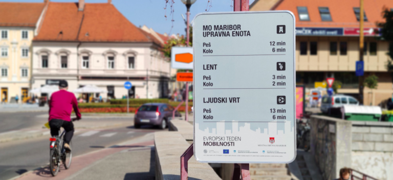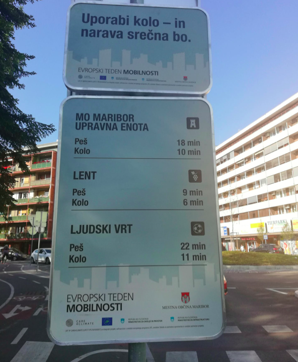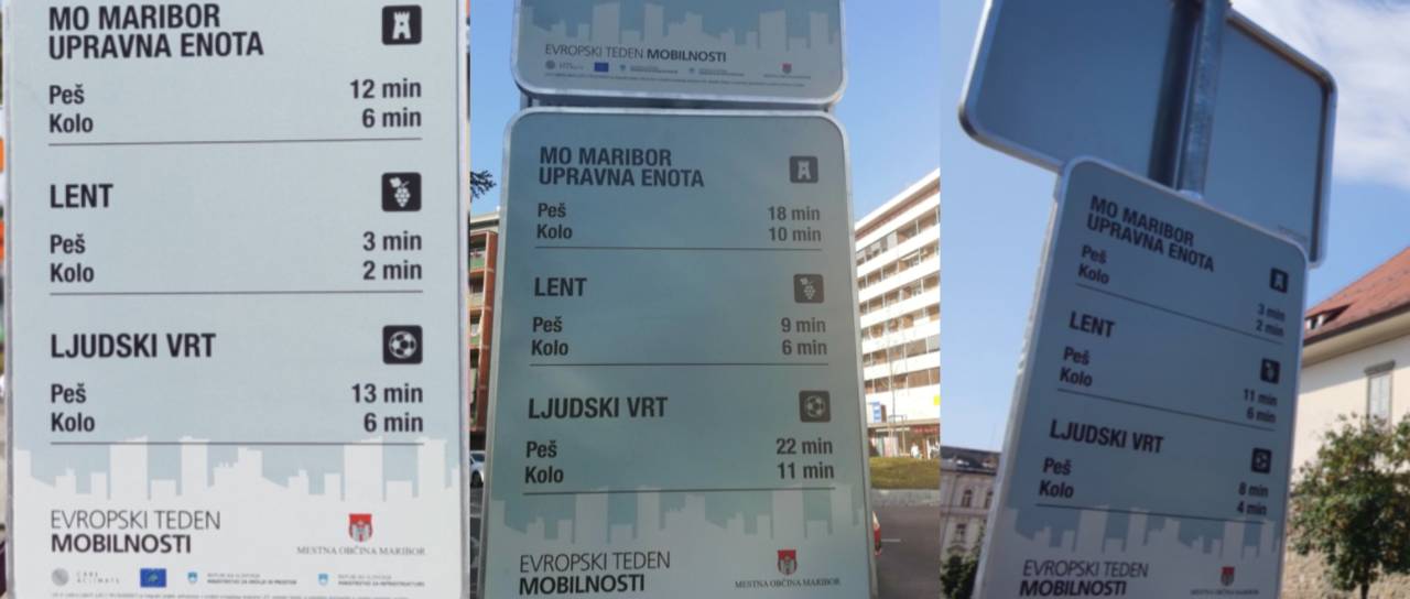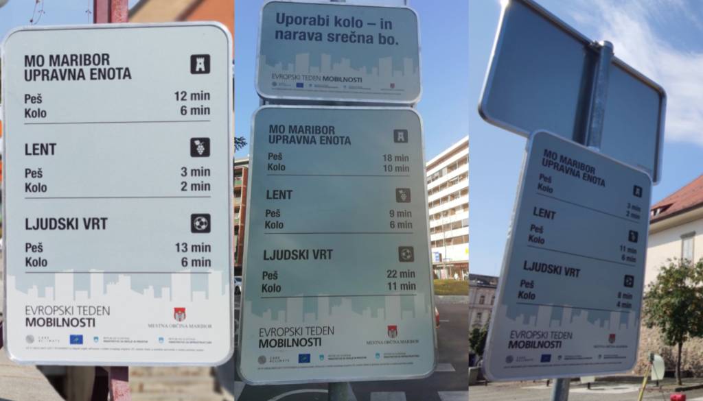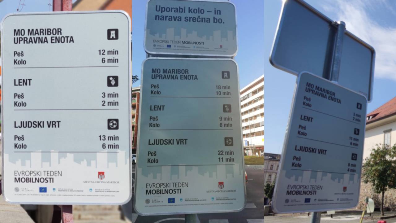 »Mestni kažipoti« seznanjajo, koliko časa je potrebno do nekaterih pomembnih lokacij peš ali s kolesom, saj občina spodbuja trajnostne načine mobilnosti.