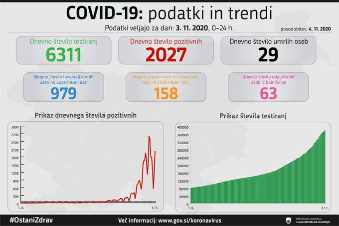 V Sloveniji so v ponedeljek, 2. novembra, opravili 6311 testiranj na koronavirus in potrdili 2027 novih okužb, delež pozitivnih je bil 32,11 odstotka vseh testiranih.