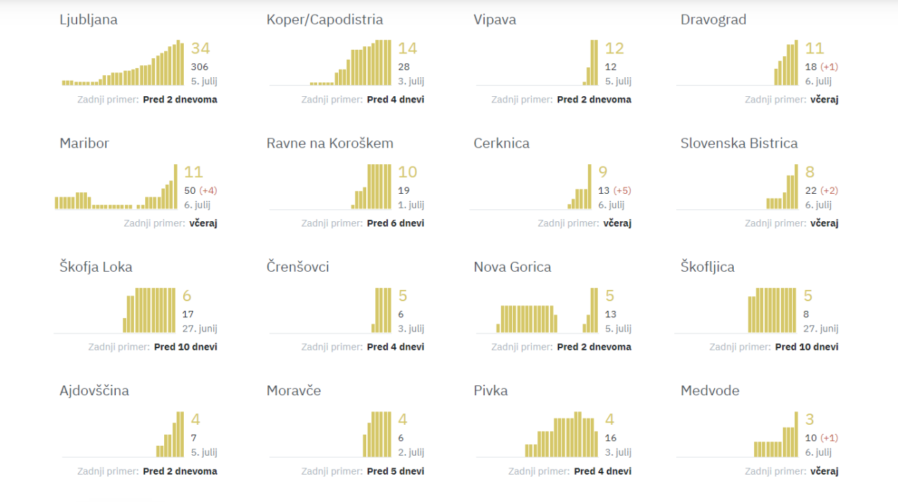 Okužbe so znova razpršene po celotni državi, pet so jih potrdili v Cerknici, štiri v Mariboru, po dve v Slovenski Bistrici, Postojni in Ilirski Bistrici, po eno pa v občinah Ribnica, Šempeter - Vrtojba, Renče - Vogrsko, Medvode, Mengeš, Trbovlje, Dravograd in Podvelka.