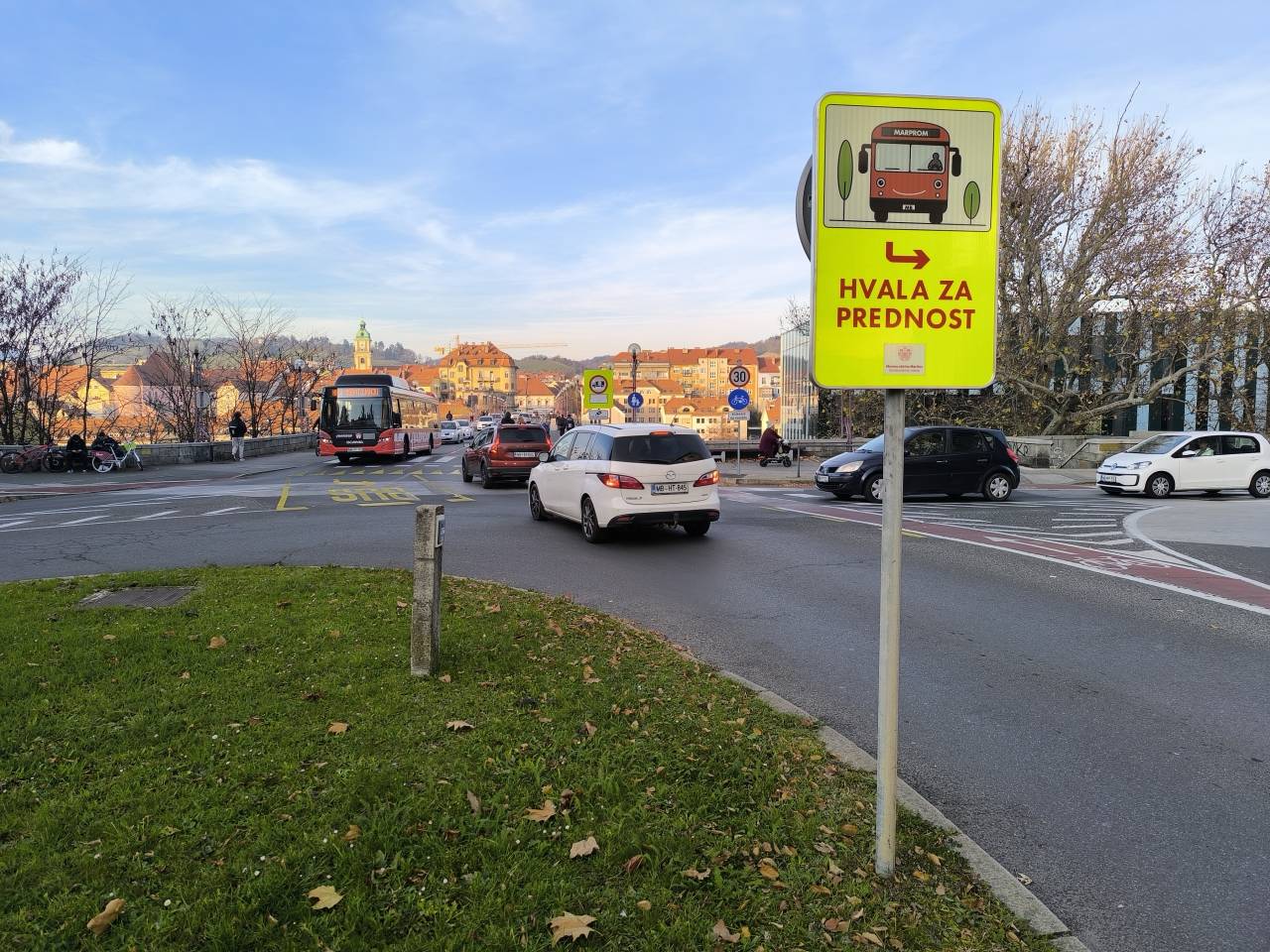 Na Trgu revolucije v Mariboru, v križišču pri Glavnem mostu, se je pred kratkim pojavil nov znak, s katerim Mestna občina Maribor voznike poziva, naj omogočijo prednost avtobusom in tako pripomorejo k bolj tekočemu avtobusnemu prometu.
