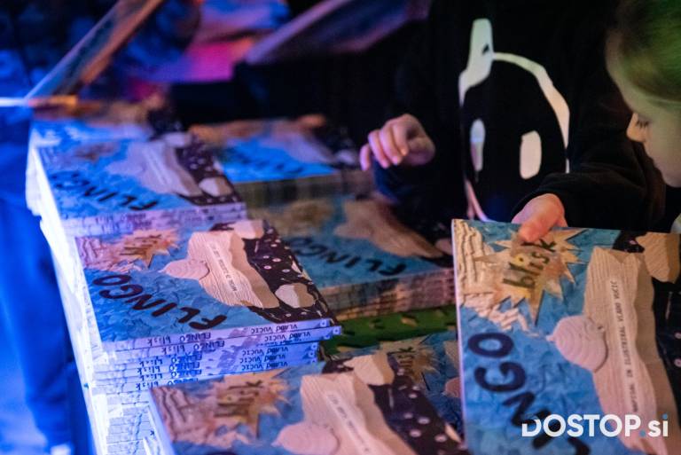 Otroci so tokrat ob darilih, ki jih je Božiček razdelil v sodelovanju ŠOUM in trgovino Baby center, prejeli še novo izdano knjigo Flingo blisk.