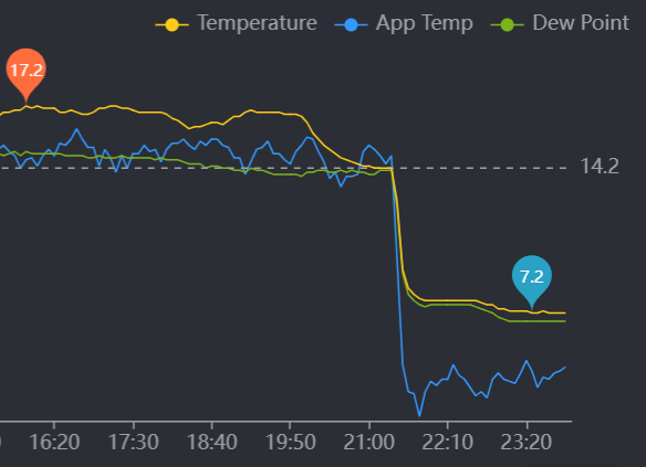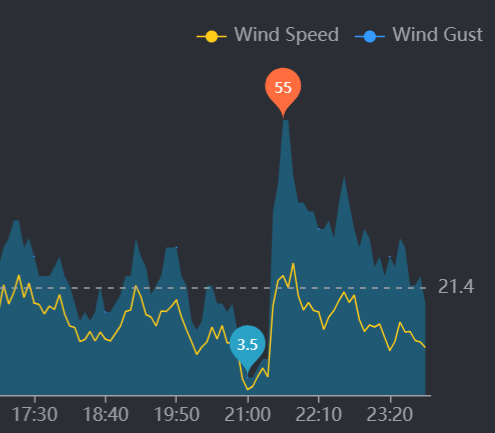 Vremenska postaja, ki je postavljena na 328 metrih nadmorske višine, je v zadnjih 24 urah spremljala hitrost vetra. Spremljala je tudi močan naliv, zelo nizek zračni tlak in izjemno hiter padec temperature v zelo kratkem času.