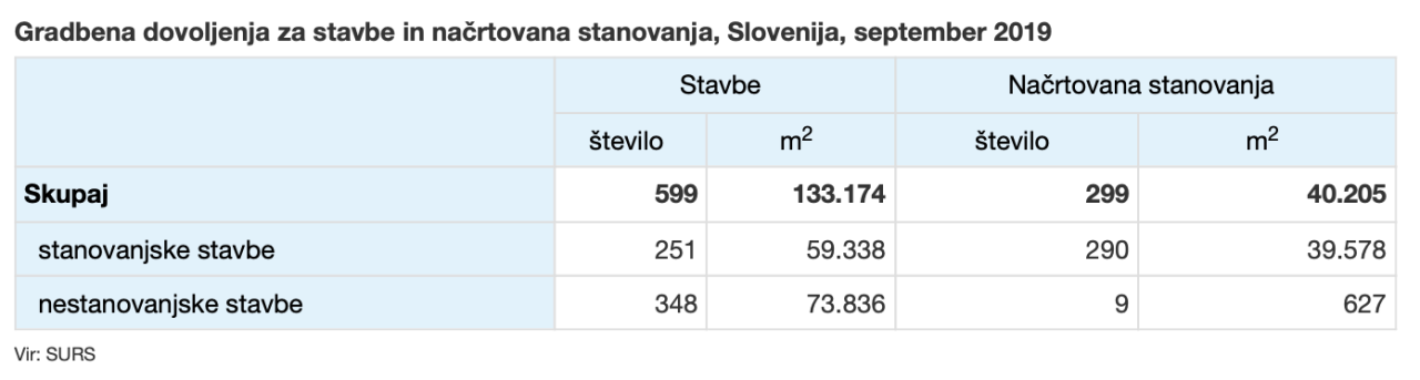 Celotna površina vseh v septembru načrtovanih stavb bo merila 133.174 kvadratnih metrov, kar je za 6 odstotkov več od površine vseh stavb, načrtovanih z gradbenimi dovoljenji, izdanimi v avgustu 2019. Površina s tokrat izdanimi gradbenimi dovoljenji načrtovanih stanovanjskih stavb bo manjša za 2 odstotka, površina načrtovanih nestanovanjskih stavb pa za 14 odstotkov večja kot z dovoljenji, izdanimi v prejšnjem mesecu, še ugotavljajo.