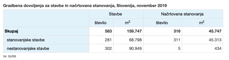 Na podlagi gradbenih dovoljenj za stavbe, pridobljenih v novembru 2019, se bo po po statističnih podatkih predvidoma zgradilo 316 stanovanj, kar je tri odstotke manj kot na podlagi dovoljenj, izdanih v oktobru.