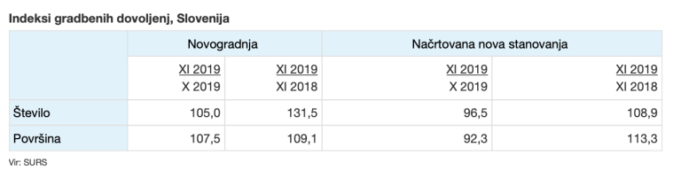 Na podlagi gradbenih dovoljenj, izdanih v novembru 2019, se bo predvidoma gradilo štiri odstotke manj novih stanovanj kot na podlagi tistih, ki so bila izdana v oktobru 2019, njihova površina bo manjša za osem odstotkov.