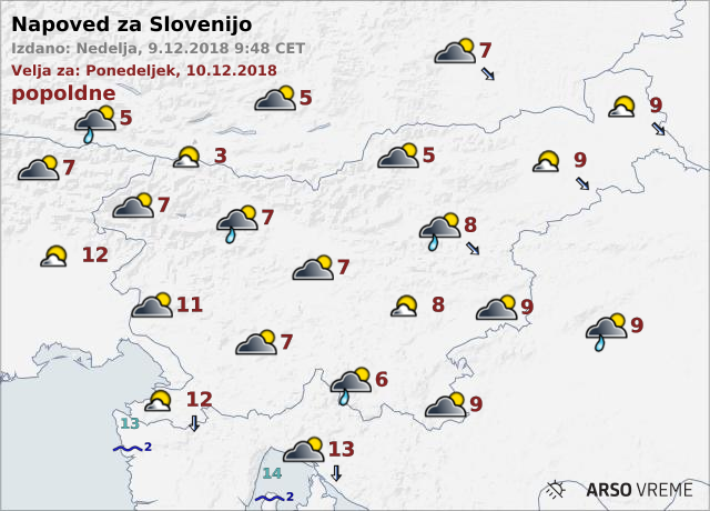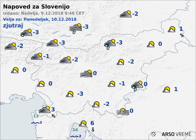 Ponoči bo zmerno, ponekod občasno pretežno oblačno, zato lahko zjutraj v kakšni kotlini pričakujemo meglo. Najnižje jutranje temperature bodo od -4 do 1 stopinje Celzija.