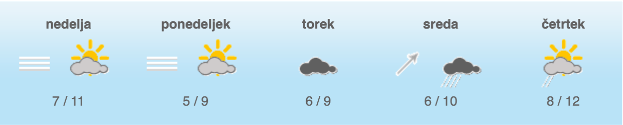 V zahodnih krajih bodo občasno lahko še manjše krajevne padavine. Na Primorskem bo pihala šibka burja. Najvišje dnevne temperature bodo od 7 do 11, na Primorskem do okoli 17 stopinj Celzija.