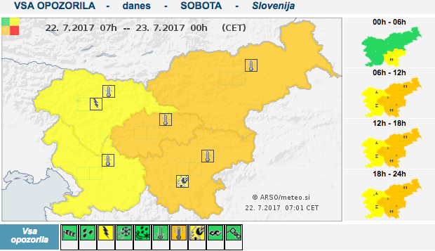 Po napovedih Agencije Republike Slovenije za okolje bo tudi danes povečini sončno. Pihal bo jugozahodni veter. Najvišje dnevne temperature bodo od 29 do 35 stopinj Celzija. Ob tem pa vremenoslovci opozarjajo, da bo danes in jutri po nižinah sredi dneva in popoldne velika toplotna obremenitev.