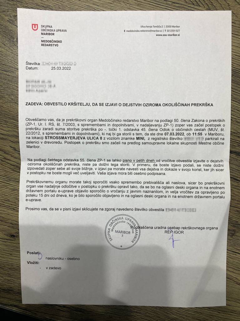 Bralec A. L. je za Mariborinfo še dodal, da po dogodku njegovo dekle na dom dobilo spodnje obvestilo kršitelju, da se izjavi o dejstvih oziroma okoliščinah prekrška.