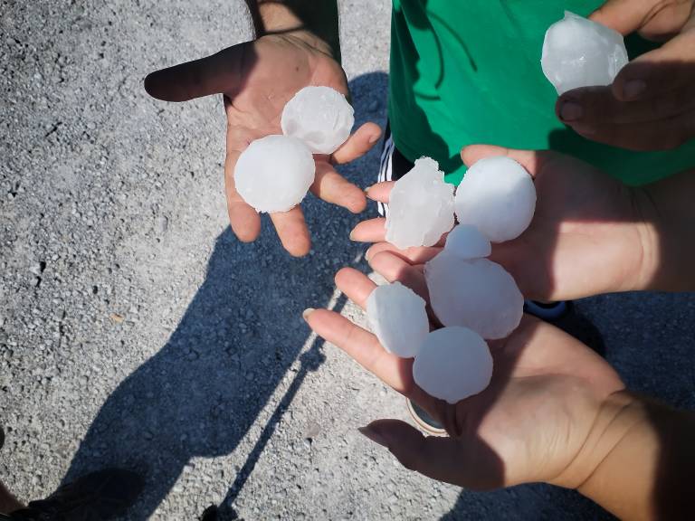 »Mi smo se v bazenu še kopali. Je bilo sončno, takšno vreme, kot je sedaj. Pa so samo naenkrat začele 'kugle' leteti dol,« je dodal Klemen.